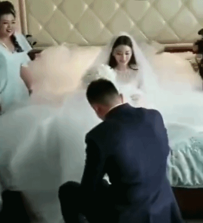 二人接親現場,張馨予身穿一襲白色婚紗手拿捧花坐在床上甜蜜微笑,何捷單膝跪地為新娘穿鞋子,還說,“不是鞋美,