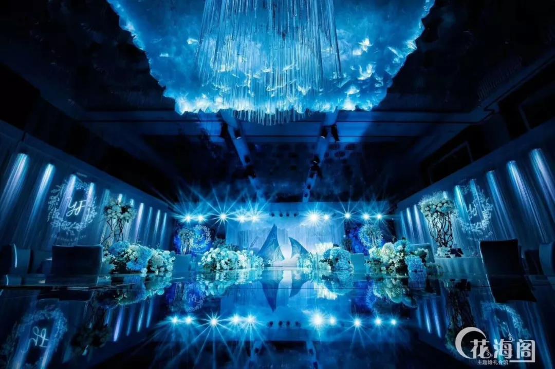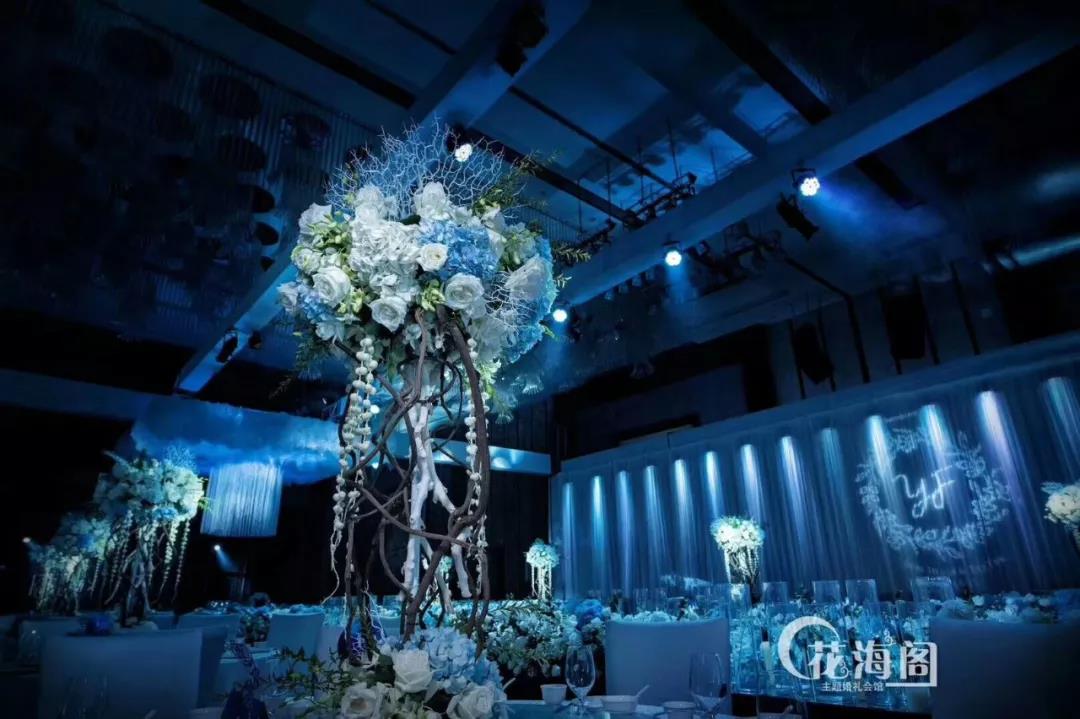 婚禮主題“永捷同馨”呼應二位新人的名字。婚禮布置通體以藍色為基調,中間多以白色裝飾,跳躍的樹枝,高飛的白鴿